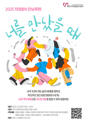 제주시자원봉사센터(센터장 김종래)는 오는 25일 제주시평생학습관 운동장과 모충사 일대에서 '2025 자원봉사 만남축제'를 개최한다고 밝혔다.'너를 만났을 때'를 주제로 진행되는 이번 축제는 시민들이 직접 자원봉사를 체험하고 나눔의 의미를 공유하는 박람회 형식으로 진행된다.1부는 자원순환 대형 현수막 제작, 자원봉사자 연극. 플래시몹 등 다양한 퍼포먼스가 진행될 예정이다.2부는 환경, 안전, 나눔을 주제로 한 체험·홍보 부스와 스토리텔링길 투어가 운영된다. 이를 통해 시민들이 일상 속 자원봉사를 자연스럽게 체험할 수 있게 된다.체험활