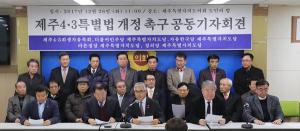 유족회·각 정당 도당26일 기자회견 개최제주4·3희생자유족회와 각 정당 제주도당이 4·3특별법 개정안 통과를 위해 한 목소리를 냈다.유족회와 더불어민주당·자유한국당·바른정당·정의당 제주도당은 26일 도의회 도민의방에서 기자회견을 열고 4·3특별법 개정안 통과를 위한 정부와 정치권의 대승적 협력을 강조했다.유족회는 지난 7월 이석태 법무법인 덕수 공동대표를 단장으로 법조인, 4·3전문가, 유족회원 등으로 구성된 '제주4·3희생자유족회 법률지원단'을 구성하고 4·3특별법 개정안 초안을 작성했다.이후 지난 19일 여·야 국