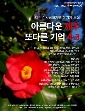 기념위 등 올해 짝수달마다전국민 대상 평화기행 실시참가자에 숙박비·식비 지원제주4·3을 기억하기 위한 걸음이 시작된다.제주4·3 70주년 기념사업위원회와 제주4·3 제70주년 범국민위원회는 올해 짝수달마다 '제주4·3 평화기행'을 실시한다고 17일 밝혔다.평화기행은 제주4·3 70주년을 맞아 전 국민을 대상으로 제주4·3을 알리기 위해 마련됐다.기념위와 범국민위는 2월22~23일 전국의 20대 청년 30명을 대상으로 평화기행의 첫 걸음을 알린다.1일차에는 3·1절 집회가 열렸던 관덕정에서 출발해 진아영 할머니 삶터,