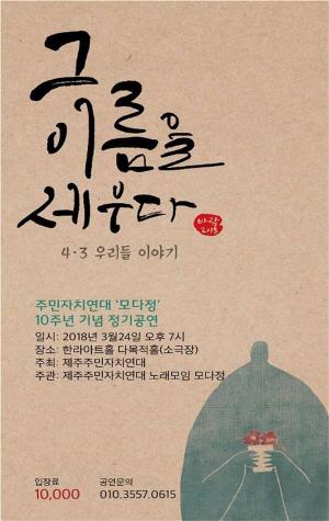 제주주민자치연대 노래모임 '모다정' 24일 제주한라대서 공연제주주민자치연대 노래모임 '모다정'이 제주의 가슴 아픈 역사인 '4·3'을 노래한다.모다정은 24일 오후 7시 제주한라대학교 한라아트홀 다목적홀에서 10주년 기념 정기공연을 개최한다고 19일 밝혔다.이번 공연은 '그 이름을 세우다 - 4·3 우리들 이야기'를 주제로 10여명의 출연진이 무대에 올라 제주4·3에 대해 노래한다.공연은 △아! 해방 △4·3 하늘을 붉어지고 △우리들 이야기 등 3부로 나눠 진행되며 '