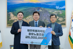 제주특별자치도 항운노동조합(위원장 박남진)은 최근 제주도청 집무실에서 도내 취약계층을 위한 성금 500만원을 제주사회복지공동모금회에 기탁했다.박남진 위원장은 "조합원들이 도내 어려운 이웃을 돕기 위해 모금했다"며 "앞으로도 나눔 활동에 적극 동참하겠다"고 말했다.