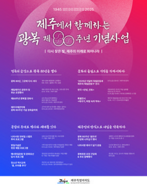 제주특별자치도가 올해 광복 80주년을 맞아 조국 독립의 정신을 계승하자는 취지로 다양한 사업을 추진한다. '다시 찾은 빛! 제주의 미래로 피어나라'라는 슬로건아래 진행되는 이번 사업은 일제로부터 독립했던 그날의 의미를 되새기고 지속가능한 제주의 미래 100년을 준비한다는 의미로 마련됐다.이에 따라 제주도는 지난 6월부터 도·교육청·민간이 하나가 되어 워킹그룹 활동을 시작했으며, 이후 광복 80주년 기념사업준비위원회를 공식 발족했다. 올해 선정된 사업은 '경축의 순간', '문화의 울림', '공감의 무대', '제주만의 방식'이라는 네