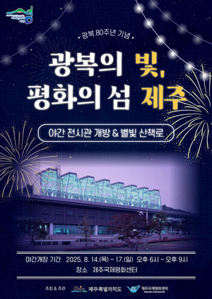제주특별자치도가 광복 80주년을 맞아 제주국제평화센터에서 야간 특별개장 행사를 운영한다.제주도는 14일부터 17일까지 4일간 제주국제평화센터(서귀포시 중문관광로 227-24) 전시관과 베릿내 작은도서관 등을 오후 6시부터 9시까지 무료로 개방한다고 밝혔다.‘광복의 빛, 평화로운 제주의 밤’을 주제로 한 야간개장은 광복의 역사적 의미를 되새기고 ‘세계평화의 섬 제주’가 지닌 평화의 가치를 제주 여름밤 빛으로 재조명하기 위해 기획됐다.주상절리를 모티브로 한 유리 아트리움 구조의 독특한 외관을 가진 제주국제평화센터는 행사 기간 동안 빛과