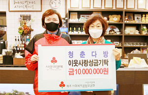 청춘다방(대표 고광민)은 최근 제주시 연동에 위치한 청춘다방에서 연말을 맞아 도내 어려운 이웃을 돕는데 써달라며 성금 1000만원을 제주사회복지공동모금회(회장 김남식)에 기탁했다. 청춘다방은 2018년부터 매년 연말연시 따뜻한 마음을 전하기 위해 성금 1000만원을 기탁해오고 있다. 고 대표는 "추운 겨울 나눔의 온기가 퍼져 모두가 따뜻한 연말을 보낼 수 있기를 바란다"고 말했다