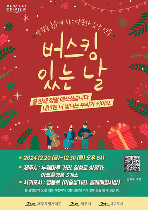 도, 30일까지 제주시, 서귀포시 문화공연 '버스킹 있는 날' 개최 연말을 맞아 특별한 버스킹 공연이 마련된다. 제주특별자치도는 오는 30일까지 제주시와 서귀포시 원도심에서 문화공연 '버스킹 있는 날'을 개최한다고 22일 밝혔다. 행사는 제주시 제주시 누웨마루 거리와 칠성로 상점가, 서귀포시 명동로와 매일올레시장에서 열린다. 공연은 제주도립예술단을 비롯, 도내 다양한 버스커 팀들이 참여한다. 이들은 최소한의 장비를 활용, 관객과 가까운 거리에서 소통하는 버스킹 문화를 선보인다. '버스킹 있는 날'은 제주형 문화가 있는 날(신(新)