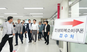 제주도는 30일 오영훈 제주도지사가 보성시장과 일도2동 주민센터를 방문해 소비쿠폰 지급·이용 현황을 점검했다고 밝혔다.민선8기 3주년 민생로드 12번째로 진행된 이번 현장 방문은 소비쿠폰의 적극적인 사용과 신청을 독려하고 현장에서 애쓰는 관계자들을 격려하기 위해 마련됐다.오 지사는 보성시장에서 소비쿠폰 사용처 등록 상황을 확인하고 시장을 찾는 소비자들이 소비쿠폰을 활용해 물품을 구입할 수 있도록 적극 안내해줄 것을 당부했다.오 지사는 "소비쿠폰은 소비부진으로 어려움을 겪고 있는 소상공인과 자영업자들에게 활력의 마중물 역할을 할 것"