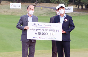 비즈플레이(대표 석창규)는 25일 아동 후원금 1000만원을 초록우산 어린이재단 제주지역본부(본부장 김희석)에 전달했다. 이번 후원금은 KPGA 코리안투어 비즈플레이 전자신문 오픈에서 1라운드부터 4라운드 동안 18번홀에 마련된 채리티 존에 공이 떨어질 때마다 20만원씩 적립하는 방식으로 마련했다.