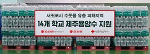 오리온그룹은 최근 수돗물 유충 발생 피해지역인 서귀포시내 14개 초·중·고등학교에 미네랄워터 '오리온 제주용암수'의 2ℓ제품 1만2120병(24t)을 지원했다고 28일 밝혔다.이번 지원품은 대한적십자사제주특별자치도지사를 통해 제공된다.오리온그룹은 지난 19일 서귀포시 주택에서 처음으로 수돗물 유충이 발견된 이후 아직 학교에서는 발견되지 않았지만 안심할 수 없는 상황이라고 판단, 서귀포 지역 학생들을 위해 미네랄워터 제품 긴급지원을 결정했다.오리온그룹 관계자는 "제주도민들, 특히 학생들의 안전한 먹거리를 위해 오리온 제주용암수를 긴급