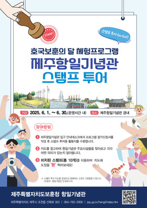 제주도보훈청(청장 배태미) 제주항일기념관은 호국보훈의 달을 맞아 6월 한 달간 제주항일기념관 스탬프 투어를 운영한다고 28일 밝혔다.이번 프로그램은 항일기념관 내·외부에 설치된 스탬프를 찾아, 각 현충시설과 제주지역 독립운동의 의미를 되새기는 기회를 제공하고자 마련됐다.참여를 원하는 사람은 현장에서 체험 참가 신청서를 작성해 접수하면 된다.스탬프는 3·1독립운동기념탑, 애국선열추모탑, 창열사 등 기념관 경내 현충시설과 전시실 내에 설치됐다.스탬프 투어 지도를 완성한 참가자에게는 선착순으로 소정의 기념품이 제공된다.배태미 보훈청장은