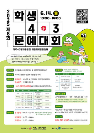 제주4·3평화재단(이사장 김종민)이 주최·주관하고 제주특별자치도교육청(교육감 김광수)이 후원하는 제8회 학생4·3문예대회가 오는 14일 오전 10시부터 4·3평화교육센터에서 개최된다.'제주4·3과 평화·인권에 대한 밝은 미래'를 주제로 열리는 이번 대회는 도내 초·중·고등학생을 대상으로 시, 산문 등 문학 부문과 사생화, 상상화 등 미술 부문으로 진행된다.대회 참가는 구글 폼에서 사전 접수하거나, 4·3평화교육센터 앞에서 현장 접수도 가능하다.총 40명이 수상하며, 수상작은 별도 작품집으로 제작, 배포된다.대상(제주도교육감상)은 부