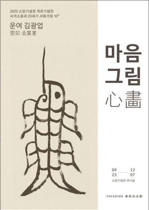 마음을 그려내는 글씨, 서예를 통해 운여 김광업의 내면세계를 만난다.서귀포공립미술관 소암기념관은 23일부터 오는 12월 7일까지 '운여 김광업, 마음그림心畵'을 전시하고 있다.이번 전시는 '서귀소옹과 서화거장'의 열번째 전시로, 서예가 운여 김광업(1906~1976)의 예술세계를 조명한다.운여 김광업은 평양 출신의 안과의사이자 서예·전각가다. 한국 현대 건축의 거장 김중업의 형이기도 하다. 그는 의술과 서예, 전각 작업을 이어가며 전통 서체와 전각 기법을 기반으로 자유분방하고 독창적인 예술세계를 구축했다.이번 전시에서는 '장춘(長春