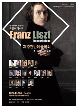 제주건반예술학회는 오늘(25일) 오후 7시 제주설문대여성문화센터 공연장에서 '제11회 정기연주회 작곡가 시리즈 - Franz Liszt'를 연다.이번 공연은 작곡가 프란츠 리스트의 곡을 편곡한 작품으로 구성된다.피아노 솔로와 피아노 앙상플 중에서 다양한 구성으로 선별해 도민들에게 친숙하면서 깊은 음악성을 느끼게 할 예정이다.리스트의 '라 캄파넬라(La Campanella)' '메피스토 왈츠 1번(Mephisto Waltz No.1)' '마제파(Mazeppa)' 등이 연주된다.이 공연의 관람료는 무료다. 박찬우 기자
