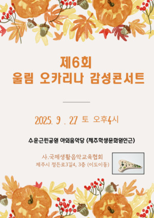 흙과 숨결이 만나 탄생한 오카리나의 음색이 가을의 감성을 자극할 예정이다.㈔국제생활음악교육협회(회장 송승헌)은 오는 27일 오후 4시 수운근린공원에서 '울림 오카리나 감성콘서트'를 연다.이번 공연은 관객의 마음을 조용히 두드리는 따뜻한 감성의 무대로 마련된다.이날 무대에서는 영화 '마녀배달부 키키'의 OST '기운이 날 것 같아요', 대중가요 '별빛 같은 나의 사랑아' '웨딩케익', 팝송 'I have a Dream' 등이 연주될 예정이다.관람료는 무료다.송승헌 회장은 "이번 공연을 통해 일상에 스며드는 작은 위로와 울림을 선사하고