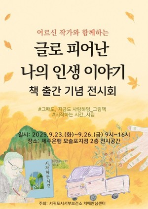 치매안심센터 프로그램 참여자들의 삶을 담아낸 책이 출간됐다.서귀포서부보건소 치매안심센터는 23일 제주은행 모슬포지점에서 치매안심센터 프로그램 참여자들이 직접 만든 그림책과 시집의 출간식을 개최했다.이번 출간식과 함께 오는 26일 오후 4시까지 작품 전시회도 병행된다.발간된 저서는 경증 치매 어르신 5명이 지난 삶의 행복한 순간을 그림과 이야기로 담아 인지 재활을 도와준 그림책 「그때도, 지금도 사랑하멍」과 치매예방교실 참여주민 8명이 삶의 경험과 애환을 시로 표현한 시집 「시(詩)작하는 시간」이다.병행되는 전시회는 누구나 자유롭게