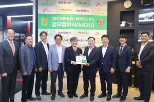 제주SK FC(대표이사 구창용)는 지난 23일 클럽하우스에서 제주양돈농협(조합장 고권진)과 제주양돈산업 및 스포츠산업 발전을 위한 업무협약을 체결했다.이번 협약에 따라 제주양돈농협은 사회적 책임과 지역사회 상생을 위한 공동 나눔행사를 실시하며 제주SK 홈 경기마다 홍보용 '제주도니(제주양돈농협 생산 브랜드)' 선물세트를 지원·증정한다.제주SK는 제주월드컵경기장내 제주양돈농협과 '제주도니' 홍보를 위한 전광판 홍보 영상 송출, 광고물 설치 및 테이블석 등을 제공하며 선수단 사인회 개최 등 홍보활동을 전개한다. 김수환 기자