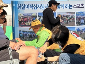 러닝 열풍으로 지난해보다 크게 늘어난 2025 평화의 섬 제주 국제마라톤대회 참가자들의 부상을 방지하고 안전사고를 막기 위해 자원봉사자들이 구슬땀을 흘렸다.이날 제주스포츠테이핑센터와 참살이적십자봉사회는 대회 시작전 선수들의 부상 방지를 위한 스포츠테이핑 부스를 운영했다.봉사자들은 스포츠테이핑을 희망하며 인산인해를 이룬 참가자들 한 사람 한 사람 모두에게 아픈 부위를 물으며 부상이 우려되는 지점을 중심으로 스포츠 테이핑을 실시했다.아울러 선수들의 완주 이후에는 노고로기적십자봉사회가 스포츠마사지 부스를 운영해 달리기로 누적된 선수들의