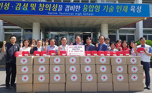 대한적십자사제주특별자치도지사(회장 오홍식)는 최근 한림공업고등학교(교장 강순구)에서 코로나19 감염 예방 및 확산 방지를 위해 3300만원 상당의 감염병 예방 키트 3030세트를 전달했다. 도민 성금으로 마련된 이번 물품은 손소독제, 마스크, 보틀, 파우치 등으로 구성됐으며, 한림읍 관내 9개교 초·중·고등학교 학생들에게 전달했다.