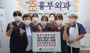 제주 수 흉부외과(원장 이길수)는 28일 수 흉부외과에서 아이들의 건강한 성장을 지원하기 위해 의료비와 교육비로 써달라며 성금 1000만원을 제주사회복지공동모금회(회장 김남식)에 기탁했다. 성금은 제주보육원 아동들에게 지원될 예정이다. 이길수 원장은 "직원들과 함께 고민하던 중 아이들이 건강하고 밝게 자라길 바라는 마음에 기부를 결심하게 됐다"고 말했다.