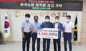 하귀농협(조합장 강병진)은 집중호우 피해복구를 위해 임직원이 모금한 성금 404만원을 지난달 31일 ㈔농촌사랑범국민운동본부(대표 정영일)에 기탁했다. 이번 성금은 집중호우 피해가 심각한 수해지역에 전달돼 침수지역 복구와 수재민 지원 등에 사용될 예정이다.