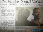 【뉴욕=뉴시스】백인 매케인과 흑인 매케인 가문은 주인과 노예라는 미국 역사의 아픔이 있었다.월 스트리트 저널(WSJ)이 17일(현지시간) 매케인이라는 성을 쓰는 흑인 가족들이 존 매케인 후보의 4대조의 노예들이라는 과거사를 조명, 대선을 불과 18일 앞두고 비상한 관심을 모으고 있다.WSJ는 이날 A섹션 1면과 백(Back)면에 걸쳐 흑인 노예의 후손인 릴