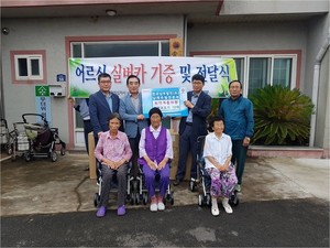 한국남부발전㈜ 남제주발전본부(본부장 박능출)은 지난 25일 송죽경로당에서 조훈배 도의원, 김대승 경로당회장 등이 참석한 가운데 대한적십자사제주특별자치도지사(회장 오홍식)에 실버카 10대를 기탁했다.이번 실버카는 퇴행성관절염, 허리 디스크 등으로 보행이 자유롭지 못한 노인들에게 도움을 주고자 마련한 것으로 제주시 안덕면 취약계층 노인들에게 지원한다. 박능출 남제주발전본부장은 "거동이 불편한 어르신들의 야외 활동에 조금이 나마 도움을 드리기 위해 실버카를 준비했다"며 "앞으로도 지역사회에 복지 증진을 위한 사회공헌 활동에 최선을 다하겠