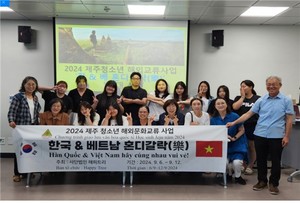 (사)해피트리(이사장 송형록)는 지난 10일, 베트남 현지에서 제주 청소년들의 제주문화의 자긍심과 글로벌마인드 향상을 위한 “2024 제주청소년 해외문화교류 사업 '한&베 혼디갈락(樂)'프로그램 발대식을 가졌다. 발대식은 참가팀 소개와 활동 계획 발표, 세계시민교육, 베트남 이해 교육 등으로 진행돼 참가학생과 학부모, 해피트리 관계자 등 30여명이 참여했다.참여학생 선발은 도내 고등학생이 2~3명씩 팀을 구성해 활동 계획서를 제출하고 심사를 통해 최종 4개팀 11명이 선발됐다.이 프로그램은 △제주의 역사, 문화, 자연 등을 알리는