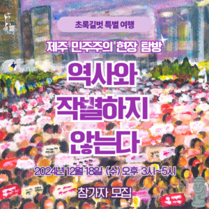 환경단체 초록길벗 18일 민주주의 현장 탐방 실시 제주환경여행단체 초록길벗은 오는 18일 제주 민주주의 현장 탐방 ‘역사와 작별하지 않는다’를 개최한다고 15일 밝혔다. 프로그램은 제주 원도심에 남겨진 근현대사의 흔적을 살피고, 제주 역사의 이해를 돕기위해 마련됐다. 탐방은 제주 민주화 운동의 중심지인 관덕정 광장을 시작으로 터, 옥성정 터, 제주신보 터, 서북청년단 터, 건국준비위원회 터 등 삼도2동 일대를 돌아보는 코스로 구성됐다. 해설은 예혁 초록길벗 대표(제주대학교 대학원 자연·문화유산교육학과 석사과정)가 맡는다. 행사는 누