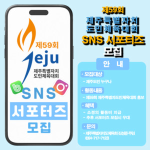 제주도체육회가 제59회 제주특별자치도도민체육대회를 맞아 SNS 서포터즈를 모집하고 영상 홍보 이벤트를 진행한다.제주도체육회는 다음달 7일까지 대회 기간 생생한 현장 모습을 기록하고 도민들에게 다양한 정보를 전달할 SNS 서포터즈를 모집한다.도민이라면 누구나 참여할 수 있으며 전문적인 홍보보다 참여와 화합을 강조하는 데 주안점을 뒀다. 도민체전을 모두가 즐길 수 있는 축제의 장으로 만들겠다는 의지가 반영된 셈이다.아울러 SNS를 활용한 영상 홍보 이벤트를 함께 진행해 도민들이 대회에 직접 참여할 수 있는 기회를 제공할 방침이다.이번