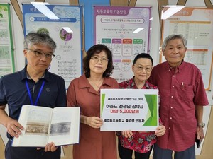 제주동초등학교 졸업생인 민문자씨가 1일 모교를 찾아 '하순도 장학금'으로 미화 5000달러(한화 694만원 상당)를 기부했다.제주동초에 따르면 한국전쟁이 발발한 1950년 제주로 피난 온 민씨는 제주동초 5~6학년 피난민 반에서 학업을 이어갔고, 당시 담임이였던 하순도 교사의 도움을 기억하며 장학금을 전달했다.민씨는 "제주동초를 졸업한 지 72년이 지났지만 하순도 선생님에 대한 감사한 마음을 항상 갖고 있어 선생님의 이름으로 장학금을 기탁하게 됐다"고 전했다.제주동초 관계자는 "기탁자의 마음을 학생들에게 잘 전달하고 훌륭한 인재로