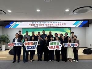 제주농협·참사랑실천학부모회 28일 업무협약청소년 건강 증진 협력…등굣길 응원 캠페인도제주농협(본부장 고우일)과 (사)참사랑실천학부모회(회장 홍영숙)는 28일 제주농협 대회의실에서 '아침밥 먹기 운동 동참을 위한 업무협약'을 체결했다.이번 협약은 건강한 식습관 형성을 통한 청소년들의 건강증진과 우리 쌀 소비 촉진에 양 기관이 협력하기 위해 마련됐다.주요 내용은 △아침밥 먹기 운동 상호 협력 추진 △청소년 대상 등굣길 응원 캠페인 전개 △쌀 소비문화 확산 및 소외계층을 위한 사회공헌 활동 지원 등이다.이에 따라 양 기관은 청소년들의 건
