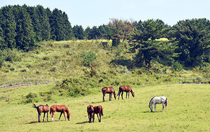 아침 저녁으로 선선해지며 가을에 접어든 9일 애월읍 중산간 지대 목장에서는 말(馬)들이 한가롭게 풀을 뜯어먹으며 '천고마비'의 계절이 왔음을 알려주고 있다. 김용현 기자
