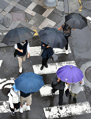 오후부터 가을비가 촉촉이 내린 24일 제주시 연동에서는 도민들이 우산을 쓰고 최근길 걸음을 재촉하고 있다.