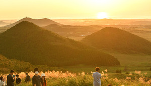 노을빛이 짙어지는 가을에 애월읍 새별오름에서는 도민과 관광객들이 황금색으로 물든 바다와 중산간 들판을 감상하고 있다. 김용현 기자