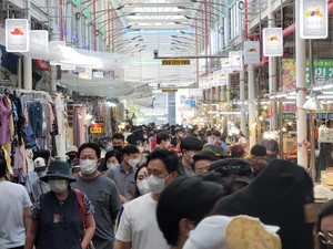 추석연휴인 2일 제주시민속 오일장에서 도민들이 마스크를 착용한 상태로 장을 보고 있다.
