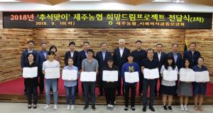 제주농협(본부장 고병기)은 18일 지역본부 대회의실에서 제주농협과 사회복지공동모금회 관계자, 도내 사회시설 관계자, 읍·면·동사무소 사회복지 담당자 등 60여 명이 참석한 가운데 '제주농협 희망드림(2차) 전달식'을 가졌다.이날 제주농협은 도움 사연을 접수하고 심사를 통해 10건을 선정해 2700만원을 전달했다.제주농협 희망드림은 제주농협 행복나눔운동본부(본부장 고병기)와 사회복지공동모금회(회장 고승화)가 공동으로 추진하고 있는 맞춤형 지원 사업으로 올해 3차례에 걸쳐 임직원 모금액 1억원을 지원한다.
