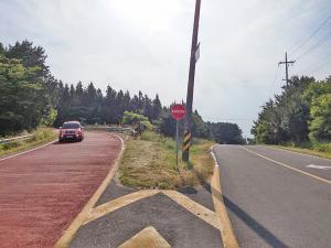 반대편 주행 차량 안보여정지선 넘고 급정거 일쑤도로구조 개선·보강 필요제주시와 서귀포시를 잇는 5·16도로에 위치한 '산록도로 입구 삼거리(5·16도로 산천단 입구)'가 기형적 도로 구조와 안전시설 미비 등으로 인해 운전자들을 사고위험에 내몰고 있다.실제 14일 산록도로 입구 삼거리. 이곳은 관음사탐방로와 제주의 대표적 명소인 신비의 도로 등을 찾기 위해 수많은 도민과 관광객 등이 이용하는 삼거리다.하지만 이날 확인 결과 옛 산천단치안센터에서 5·16도로로 향하는 도로 오른쪽으로 소나무 숲이 울창하게 조성돼 있어 운전