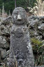 # 제주의 독특한 토지신상제주에는 희귀한 석상이 있는데 좀처럼 보기 드문 토지신상이 그것이다. 토지신이란 특정한 영역을 지키는 땅의 신을 말한다. 산담으로 둘러진 무덤에는 영혼의 입장에서 보면 용미(龍尾) 왼쪽에 조그만 사각형의 단이 있다. 이를 토신단이라고 하는데 토지신에게 제사를 지내는 곳이다. 무덤의 땅 주인인 토지신에게 제사를 지내는 이유는, 사계(