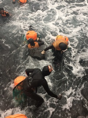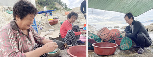 "더는 해녀 못해. 받아주지 않기로도 했고 물건도 점점 없어져서"영도해녀문화전시관 앞 바다에 테왁꽃이 폈다. 익숙하지만 어딘지 안타깝다. 이날 작업 나온 해녀는 6명. 올해 82세인 김영호 할머니부터 작업조에서는 가장 나이가 어린 고금순 할머니(69)까지 차례로 물 밖으로 나왔다. 멀리 자맥질 하는 모습을 보고 한참 기다려 만난 해녀들 사이에서 다투는 것 같은 툭툭거리는 말투와 웃음이 쏟아진다.△나이를 먹는 바다해녀 망사리에서 나온 건 말똥성게 한 무더기다. 제주에서 흔히 보이는 보라성게와 비교하면 한 눈에도 덩치가 작아 보인다.