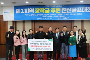 국제로타리3662지구 제1지역(총재지역대표 현종협)은 지난 10일 라온컨트리클럽에서 열린 제1지역 장학금 후원 친선골프대회를 통해 초록우산 어린이재단 제주지역본부(본부장 김희석)에 장학금 200만원을 기탁했다.이번 후원금은 제1지역 소속 제주·한림·한마음·돌담·늘해랑·화목·노블·지성·청담·기적·동행·우정·울림로타리클럽에서 마련한 것으로, 도내 가족돌봄 아동들에게 전달될 예정이다.