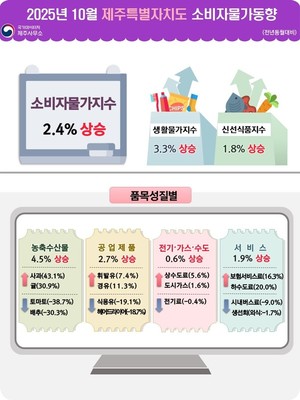 제주지역 소비자물가가 지난해보다 2.4%나 상승했다.일부 채소류의 가격 하락에도 불구하고 농축수산물과 유류, 서비스 가격 등이 전반적으로 오르면서 물가상승률이 18개월 만에 최고치를 기록했다.4일 국가데이터처가 발표한 ‘2025년 10월 제주특별자치도 소비자물가동향’에 따르면 10월 제주지역 소비자물가지수는 117.04로 지난해 같은 기간에 비해 2.4% 상승했다.이는 2.5% 상승을 기록했던 지난해 4월 이후 18개월 만에 최대 상승폭이다.제주 물가상승률은 지난 8월까지 1%대에 머물렀지만 9월 2.2%로 크게 오른 후 10월에도