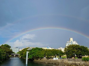 22일 오전 9시께 제주 외도동에 소나기가 쏟아진 뒤 하늘에 행운을 상징하는 쌍무지개가 떠 출근길 도민들의 마음을 녹였다. 김은수 기자