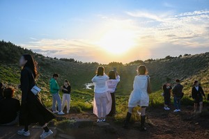 지난 5일 오후 6시 가을 노을빛이 더해진 제주시 한림읍 금오름 정상에서 많은 도민과 관광객들이 기념촬영을 하고 있다. 김은수 기자
