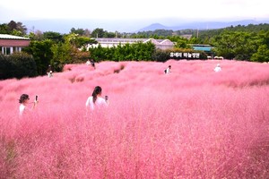 지난 2일 서귀포시 남원읍 신례리 휴애리 자연생활공원을 찾은 나들이객들이 분홍빛 향연의 아름다움이 절정을 이루고 있는 핑크뮬리를 감상하고 있다.