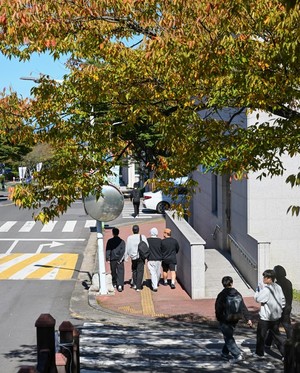 모처럼 청명한 가을 날씨를 보인 24일 오후 제주대학교 학생들이 단풍으로 물들어 가는 캠퍼스를 거닐고 있다. 김은수 기자