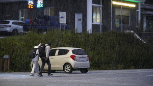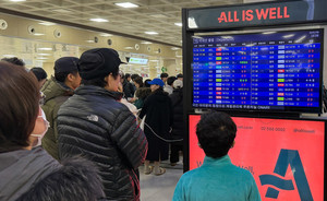 9일 강풍을 동반한 많은 눈이 내린 제주에서 항공기 결항이 잇따르면서 승객들이 오후 제주국제공항 국내선 출발장 전광판 결항 안내를 확인하고 있다.