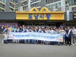 제주시는 19일 도남시장에서 자생단체, 공무원 등 50여명이 참여한 가운데 수눌음 소비 캠페인을 전개했다.이날 캠페인을 통해 도남시장과 인근 상점가를 찾은 시민들에게 전통시장 이용을 독려하는 장바구니 등 홍보물을 배부하는 등 지역사회 소비 촉진을 위한 홍보 활동을 펼쳤다.또 참여자들간 전통시장과 지역상권을 적극 이용하겠다고 결의했다. 제주시 관계자는 "이번 캠페인을 계기로 전통시장과 골목상권에 더욱 많은 관심과 발길이 이어지길 기대한다"며 "앞으로도 시민들과 함께하는 소비문화 확산을 통해 지역상권에 활력을 불어넣을 수 있도록 노력하