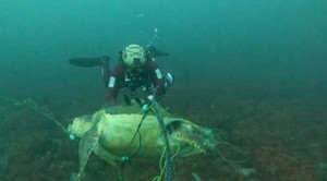 폐그물에 걸려 서귀포 바다에 떠다니던 바다거북이 해경에 의해 안전하게 구조됐다.17일 서귀포해양경찰서에 따르면 오후 3시 40분께 서귀포시 대포동 주상절리 인근 해상에서 바다거북 1마리가 그물에 걸려 이동하지 못하고 있다는 수상 레저객의 신고가 해경에 접수됐다.신고를 받고 출동한 서귀포해경 구조대는 물속으로 들어가 바다거북을 감싸고 있는 그물을 절단해 구조하고 다시 바다의 품으로 돌려보냈다. 해경은 전문가에게 문의한 결과, 구조한 거북의 종류는 멸정위기종인 붉은바다거북으로 추정되며 길이는 약 130cm, 폭은 약 80cm로 확인됐다