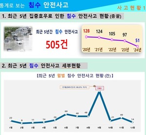 최근 이상기후로 인해 태풍과 집중호우가 잦아지는 가운데 제주소방이 침수 안전사고 주의보를 발령하고 안전관리에 나선다.제주소방안전본부는 태풍과 집중호우로 인한 인명·재산 피해 예방을 위해 '침수 안전사고 주의보'를 22일부로 조기 발령한다고 밝혔다.최근 5년간 도내에서 발생한 침수 안전사고는 2020년 128건, 2021년 124건, 2022년 105건, 2023년 97건, 지난해 51건 등 총 505건이다.이 중 9월에 발생한 사고는 38.2%(193건)로 가장 많았으며 가을철에 발생한 비율이 절반을 넘는 것으로 나타났다.주요 사고