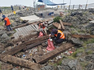 제주의 상징이자 세계자연유산인 한라산 정상에서 19년간 쌓여온 쓰레기 더미가 모습을 드러냈다.21일 해발 1950m 한라산 백록담 동능. 작업자들이 나무 데크를 하나둘 들어내자, 그 밑에서 생활폐기물이 쏟아졌다. 생수 페트병, 과자 봉지, 초코바 포장지, 컵 뚜껑, 티슈, 심지어 조리용 발열팩까지 먹고 남긴 흔적이 고스란히 남아 있었다.일부는 데크 틈 사이로 밀어 넣은 듯 바위와 목재 아래 깊숙이 처박혀 있기도 했다.이곳 나무 데크는 2006년 탐방객 편의를 위해 설치돼 약 572㎡에 걸쳐 깔려 있다. 정상부는 탐방객들이 쉬어갈 수