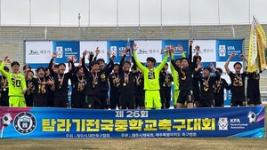 제주에서 열린 전국중학교 축구대회에서 부산SAHA FC U15가 처음으로 탐라기 우승컵을 들어올렸다. 지난해부터 공식 경기로 인정된 U14 유스컵에서는 서울장안중학교가 우승의 영예를, 부산SAHA FC U15(1학년)가 준우승의 영예를 안았다.대한축구협회(회장 직무대행 김정배)와 제주시가 공동주최하고 제주시체육회(회장 최기창)와 제주특별자치도축구협회(회장 윤일)가 주관하는 제26회 탐라기 전국중학교 축구대회가 25일 오후 3시 제주시종합경기장에서 열렸다.이날 오후 3시부터 열린 결승전에서 부산SAHA FC U15는 서울석관중을 1-